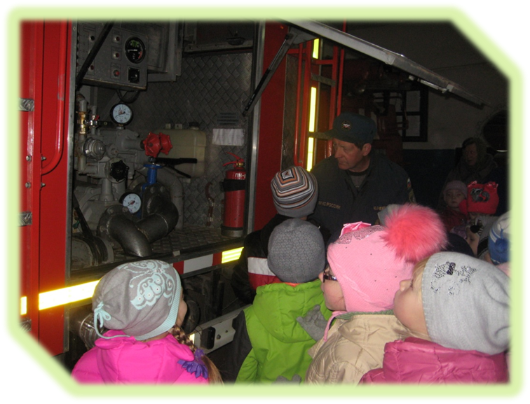 Ребят встретил сержант внутренней службы Кузин Андрей Павлович. Вместе с водителем, Чаркиным Сергеем Николаевичем, он познакомил ребят с устройством пожарной машины. Дошкольники узнали, сколько нужных, полезных секций есть в пожарной машине.