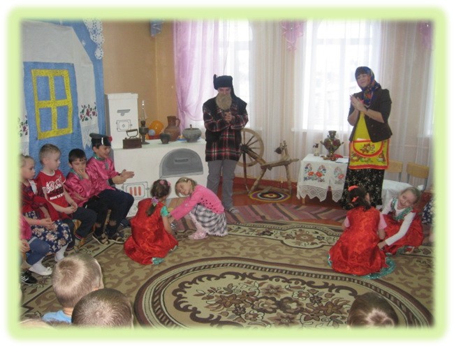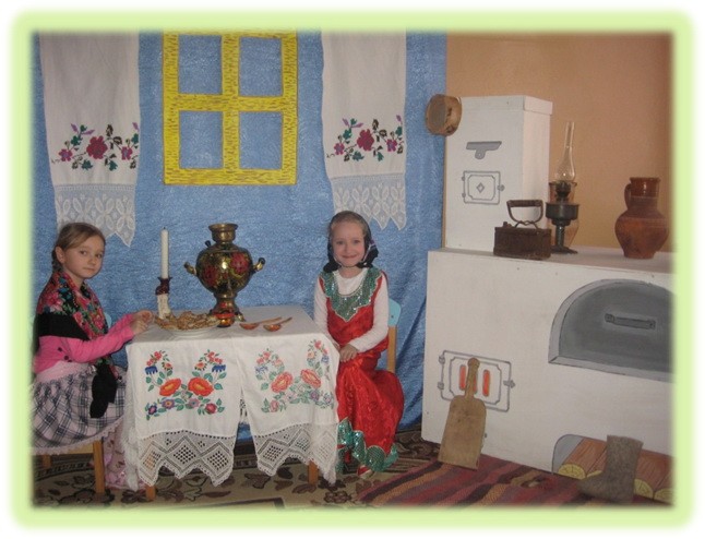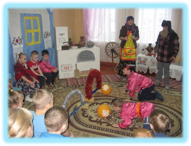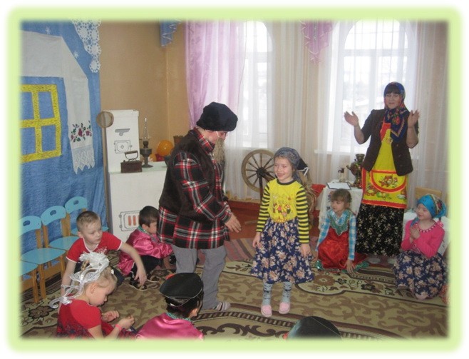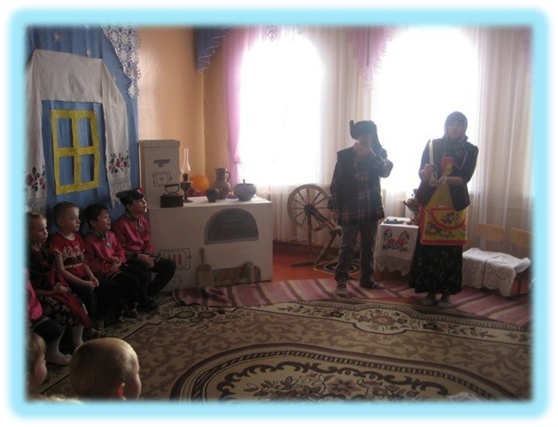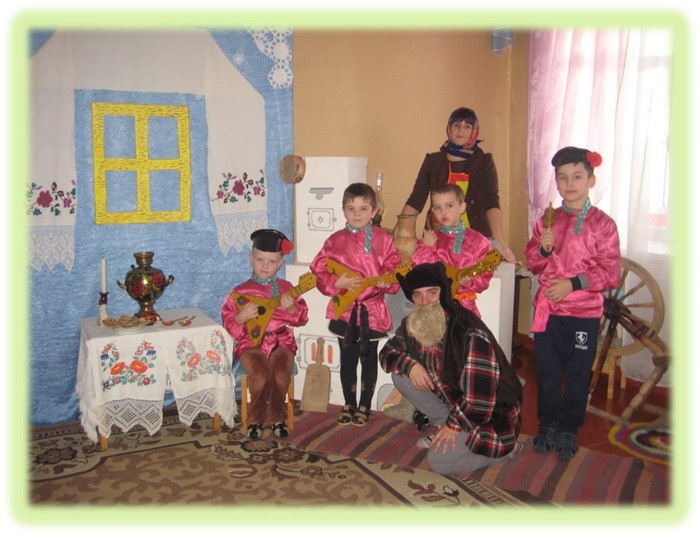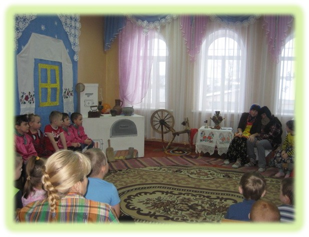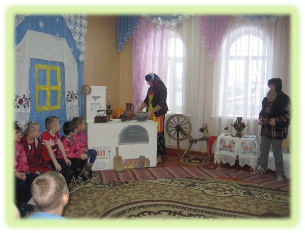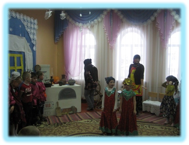 «Колядовщики» пригласили всех ребят и взрослых в музыкальный зал. Именно здесь, проходили Рождественские посиделки. Радушные хозяева, Дед и Бабка, встретили «колядующих».