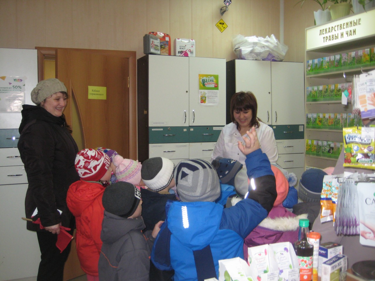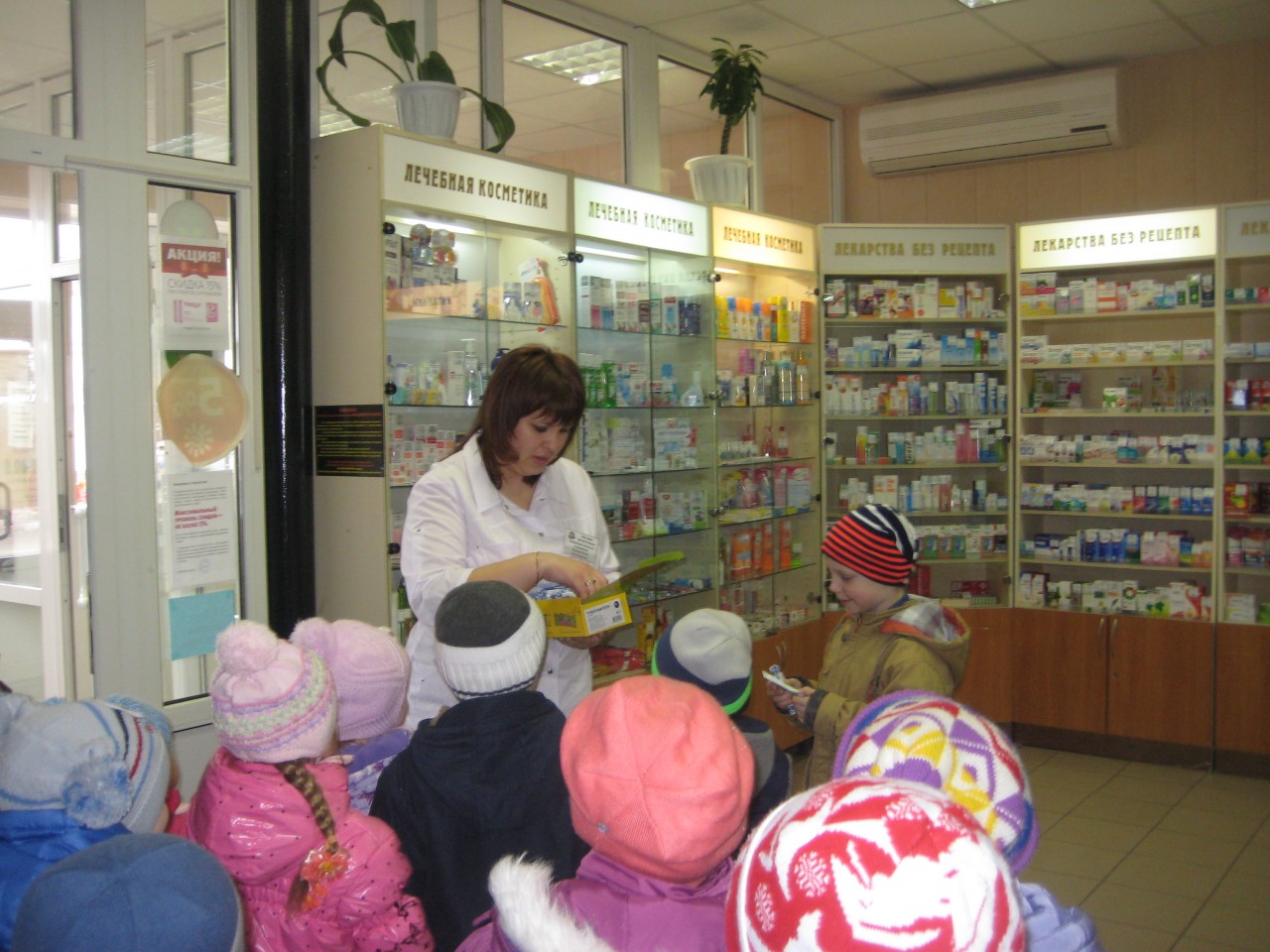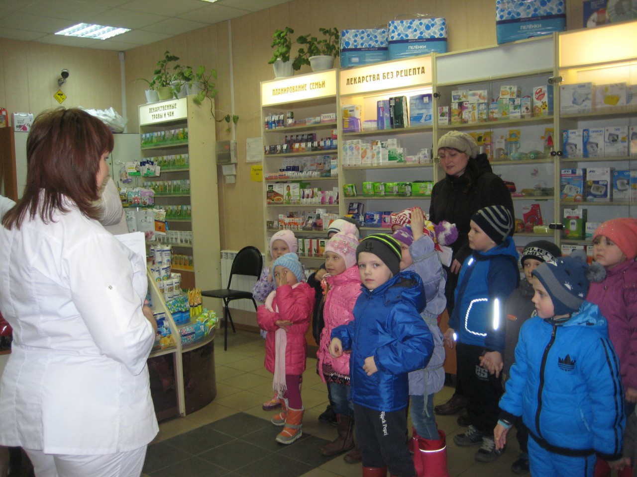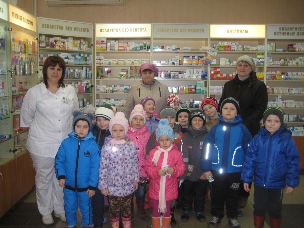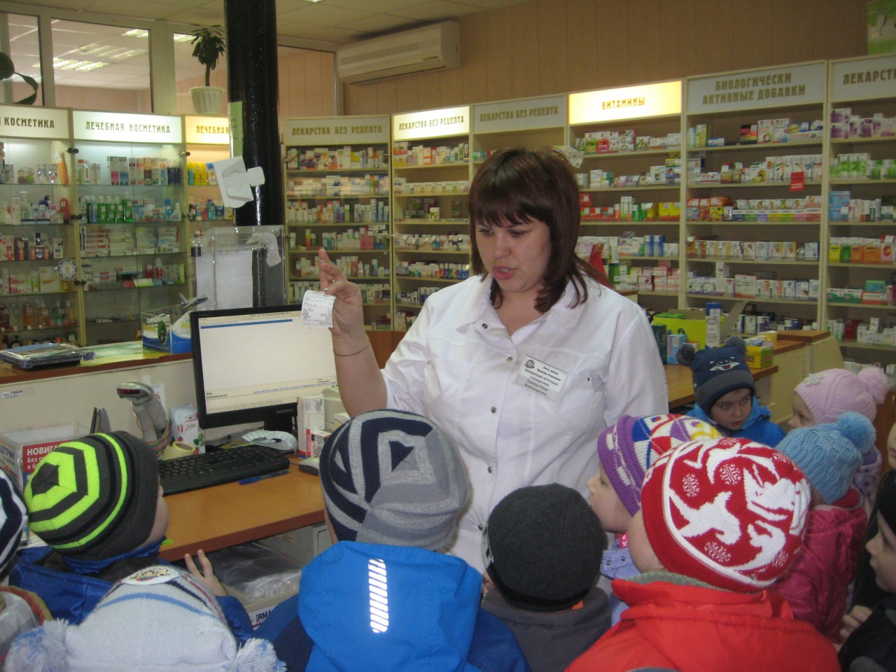 Во время экскурсии в аптеку зашел покупатель. Ребята с интересом наблюдали за тем, как происходит отпуск лекарств. Наибольшее удивление у ребят вызвал компьютер.  Провизор отметила, что компьютер помогает им узнать информацию о наличии лекарства в аптеке.
