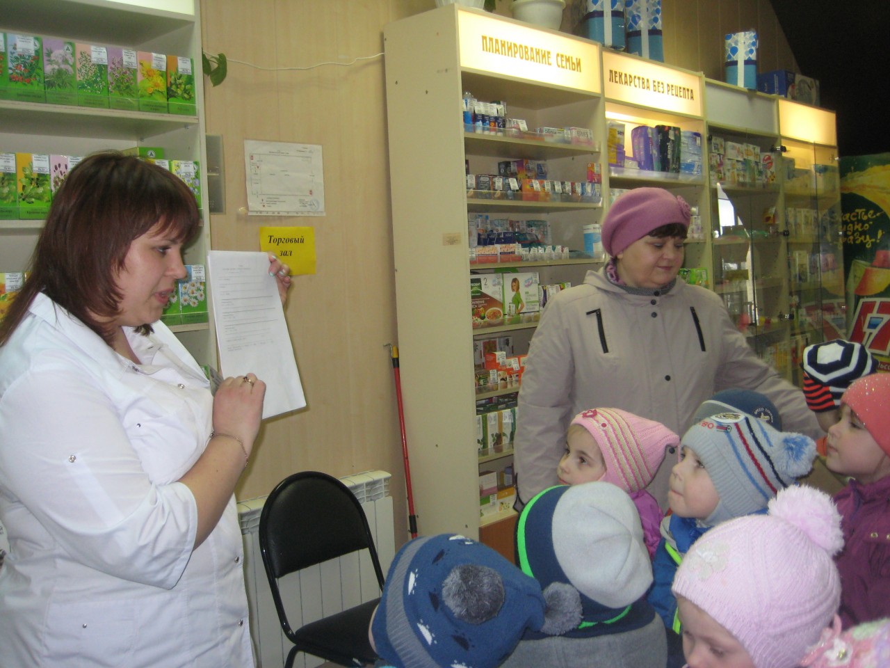 В аптеке детей встретила заведующая – Тишаева Юлия Александровна.  Юлия Александровна рассказала, что аптека – это магазин, в котором все покупатели могут приобрести необходимые для лечения и оздоровления лекарственные средства. Ребята узнали, что продавцов в аптеке называют фармацевтами. , что фармацевт – это не просто продавец, а человек со специальным медицинским образованием, который может дать покупателю совет при выборе лекарств.