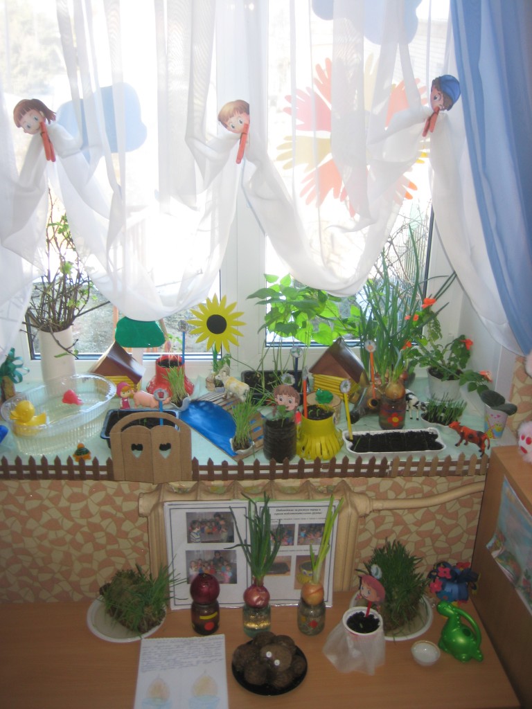 Каждая группа подготовила оригинально оформленные огороды. Педагоги проявили фантазию, творчество при оформлении посадок: вторая младшая группа эстетично оформили «Веселую полянку», в средней группе во всем многообразии представлен «Урожай на даче», в старшей группе «трудолюбивые хозяева» показали свои весенние посевы, в подготовительной к школе группе порадовала своим разнообразием посадок, всходов «Красочная деревенька». Активное  участие в оформлении, посеве и уходе за «огородом»,  приняли участие дети.  Воспитатели подготовительной к школе группе представили не только зарисовки наблюдений за ростом лука, посаженного в трех разных условиях, но и оформили альбом с фотографиями, ходом наблюдений и выводами, с подборкой стихов, загадок, пословиц по теме.