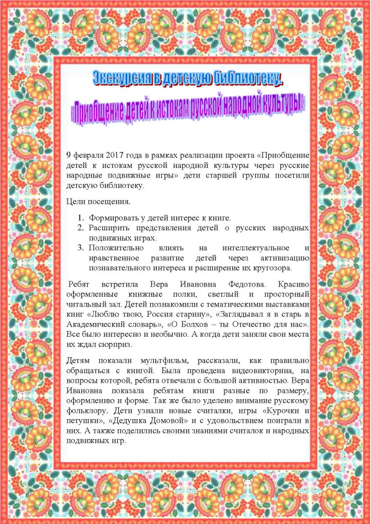 Экскурсия в детскую библиотеку «Приобщение детей к истокам русской народной культуры»