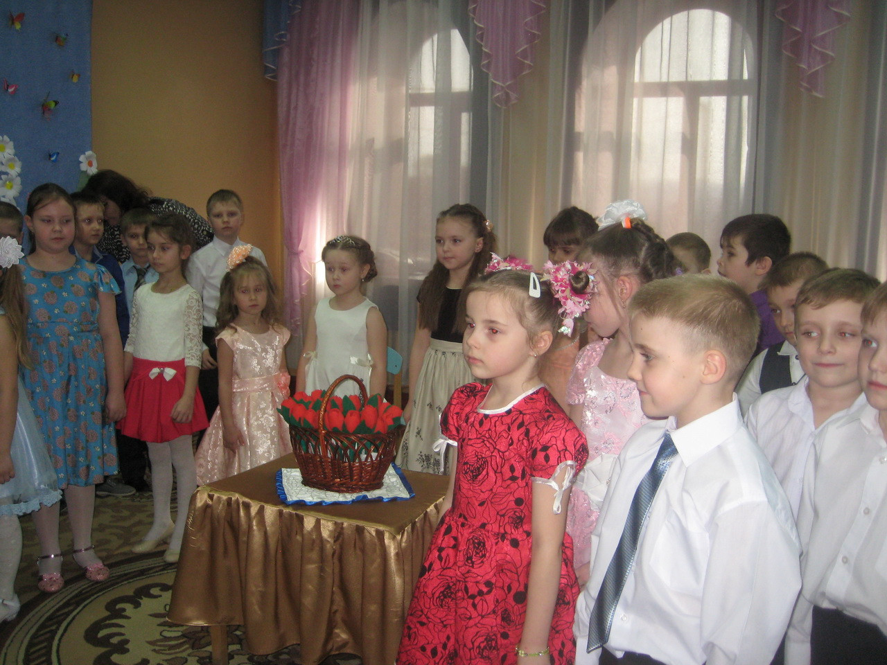 Неожиданно у детей подготовительной группы на празднике появилась «мамаша» с двумя невоспитанными дочками. На протяжении всего утренники ребята учили их хорошим манерам, воспитанности. Глаза родителей святились от счастья, когда в исполнении детей звучали песни, проникновенные стихи, ребята исполнили парный танец, танец со свечами. Корзина с красными тюльпанами, изготовленная детьми, была ярким подтверждением безграничной любви к маме.