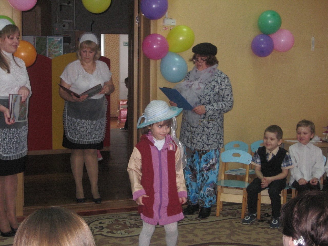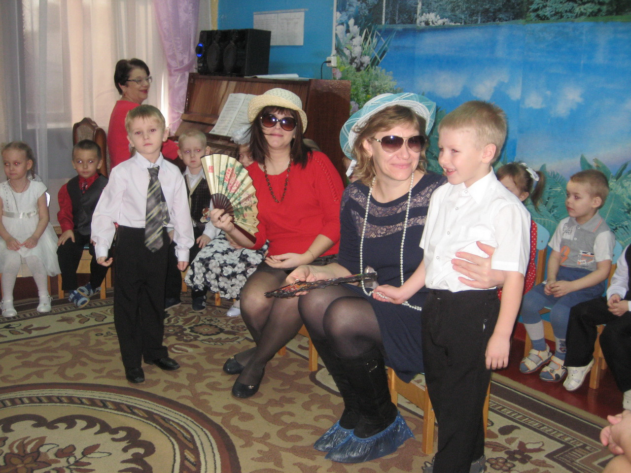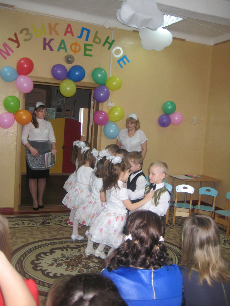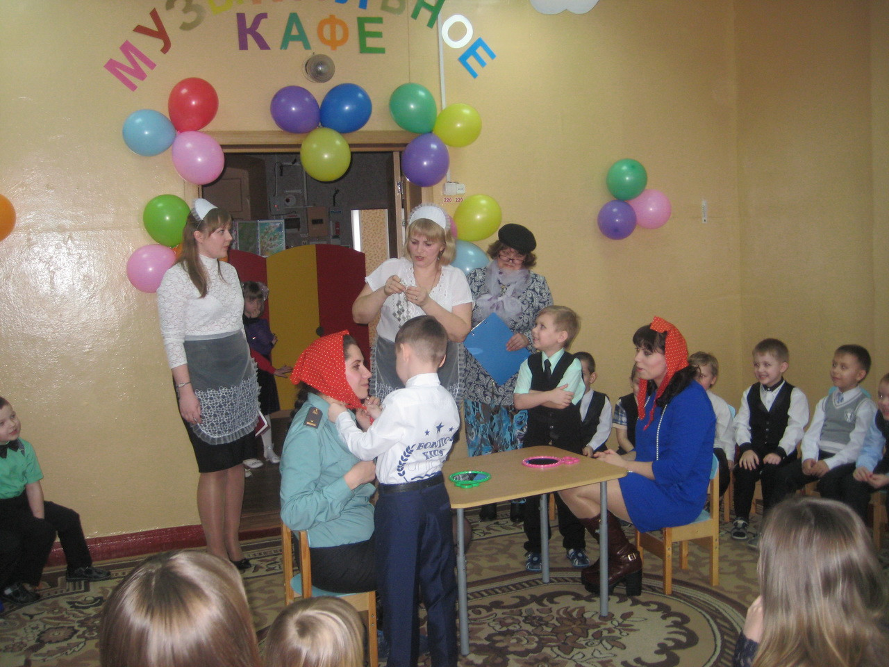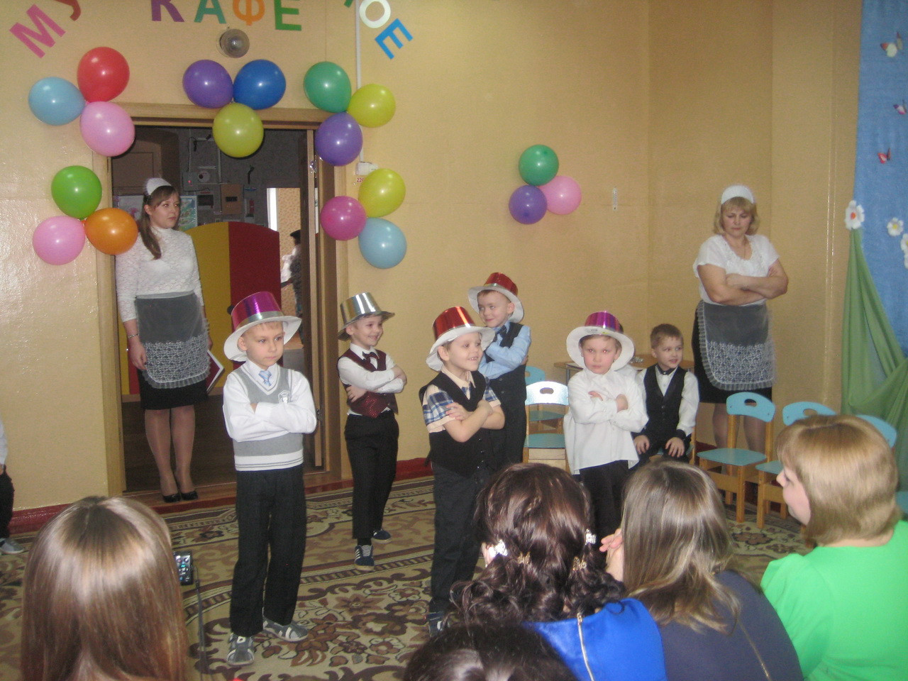 Музыкальное кафе собрало в гостях мам, бабушек, сестричек воспитанников старшей группы. Для приглашенных было приготовлено разнообразное «меню»: блюдо «Винегрет» - пары продемонстрировали танец – попурри, блюдо «Кофе, взбитое со сливками», блюдо «Исторический плов». Мальчишки исполнили сценку «Бабушки - старушки». В Музыкальное кафе был приглашен знаменитый Кутюрье Вячеслав Зайцев. Кутюрье устроил дефиле своих последних моделей. На последок представлено блюдо – «Удиви ты меня, удиви». Совместный танец мам и мальчиков растрогал всех.