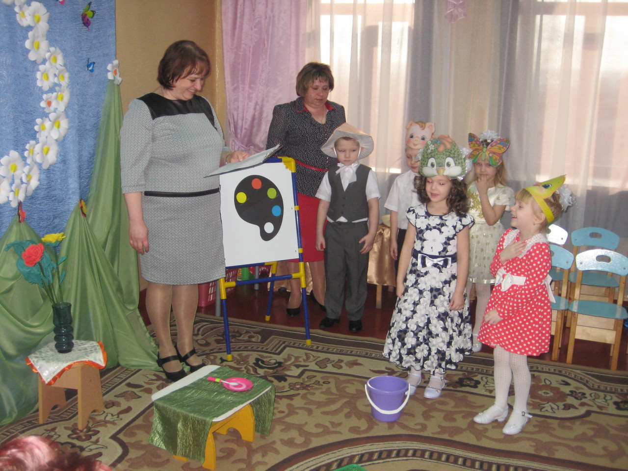Воспитанники средней группы помогли доброму Художнику вернуть разноцветные краски на палитру. Ведь Черная клякса закрыла все краски и палитра стала черной. С помощью заданий - подсказок ребята расколдовали краски. Девочки и мальчики дружно разгадывали загадки, исполнили танец кукол, танец с цветами, вместе с родителями сыграли в игру «Пяточка – носочек». Дети разыграли поучительную сказку про цыпленка Цыпу, который не хотел помогать своей маме, но после встречи с друзьями понял, как приятно делать хорошие дела.